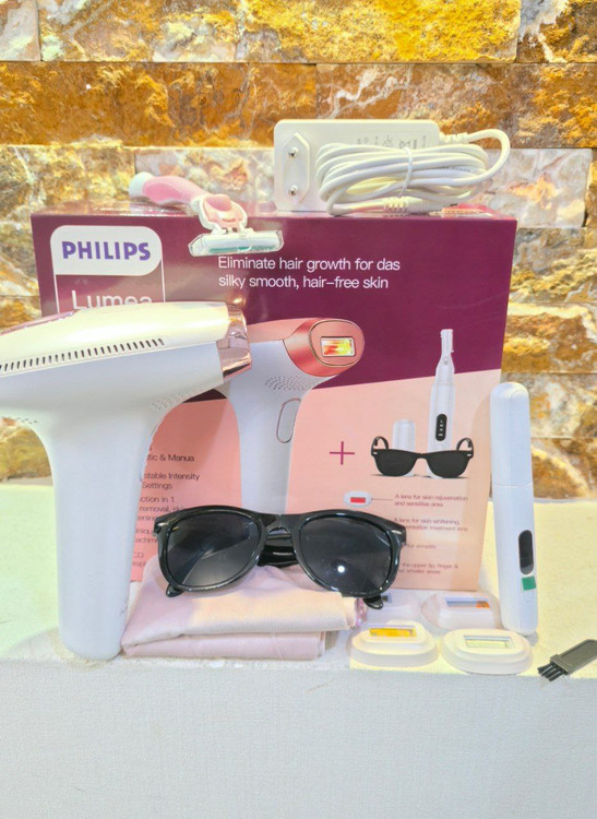 دستگاه حذف موهای زائد با تکنولوژی IPL از برند فیلیپس، مدل Lumea را نشان میدهد. این دستگاه برای استفاده خانگی طراحی شده و با پالسهای نوری، رشد مو را کاهش میدهد.
